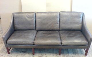 Meget falmet og slidt sofa og lænestole i semianillin, brunt læder.